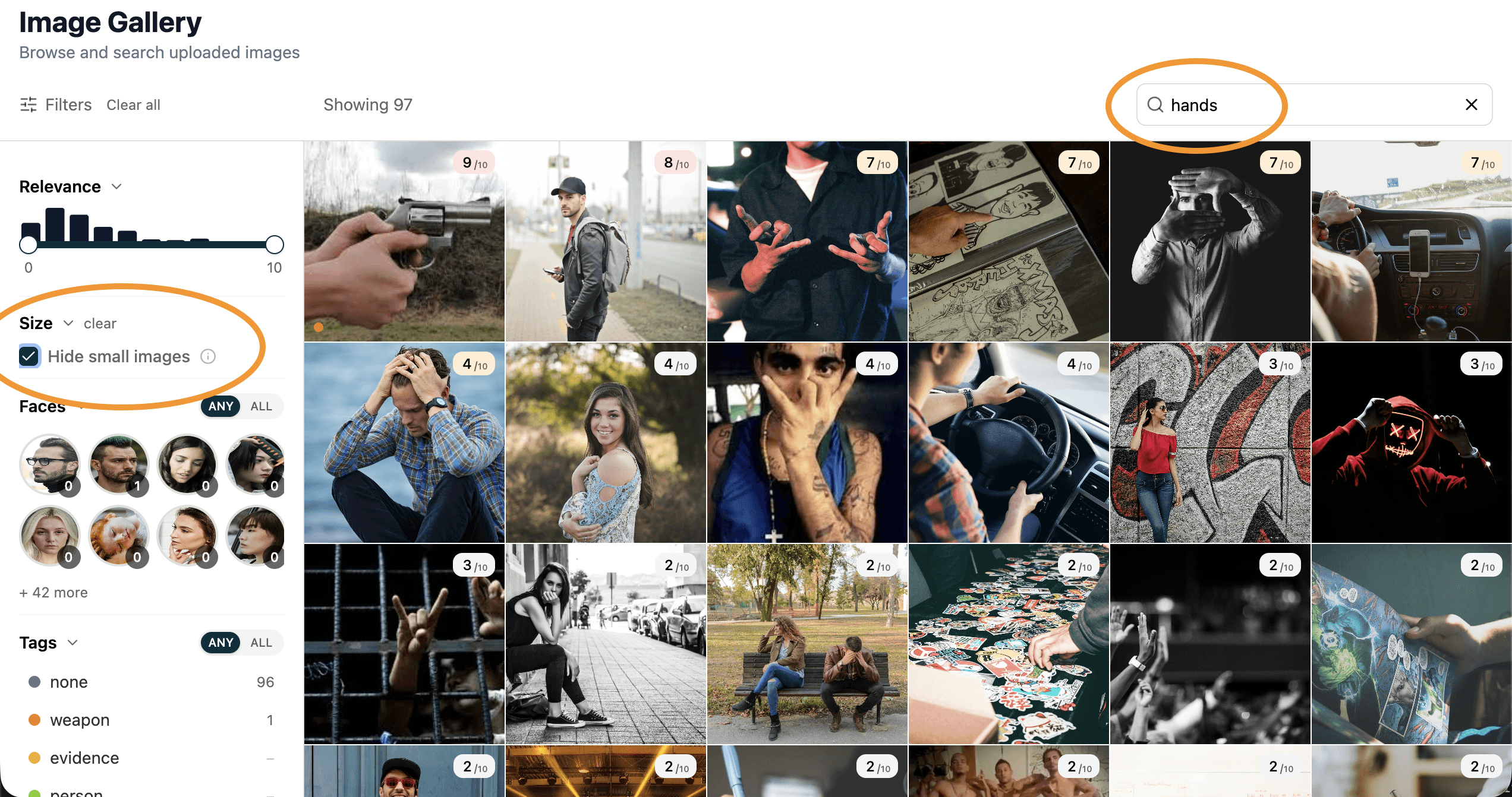 Our AI now looks for these details, like physical descriptions of people, cars, and weapons, in every new piece of evidence you upload. The system will highlight these for you by ranking them with higher relevancy scores.