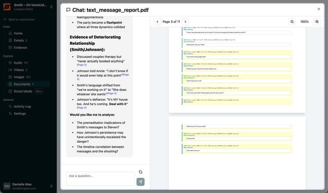 Type a question in plain language and Longeye searches every video, recording, message, and image in the case. Findings are ranked by relevance and linked directly to the exact moment in the source evidence.