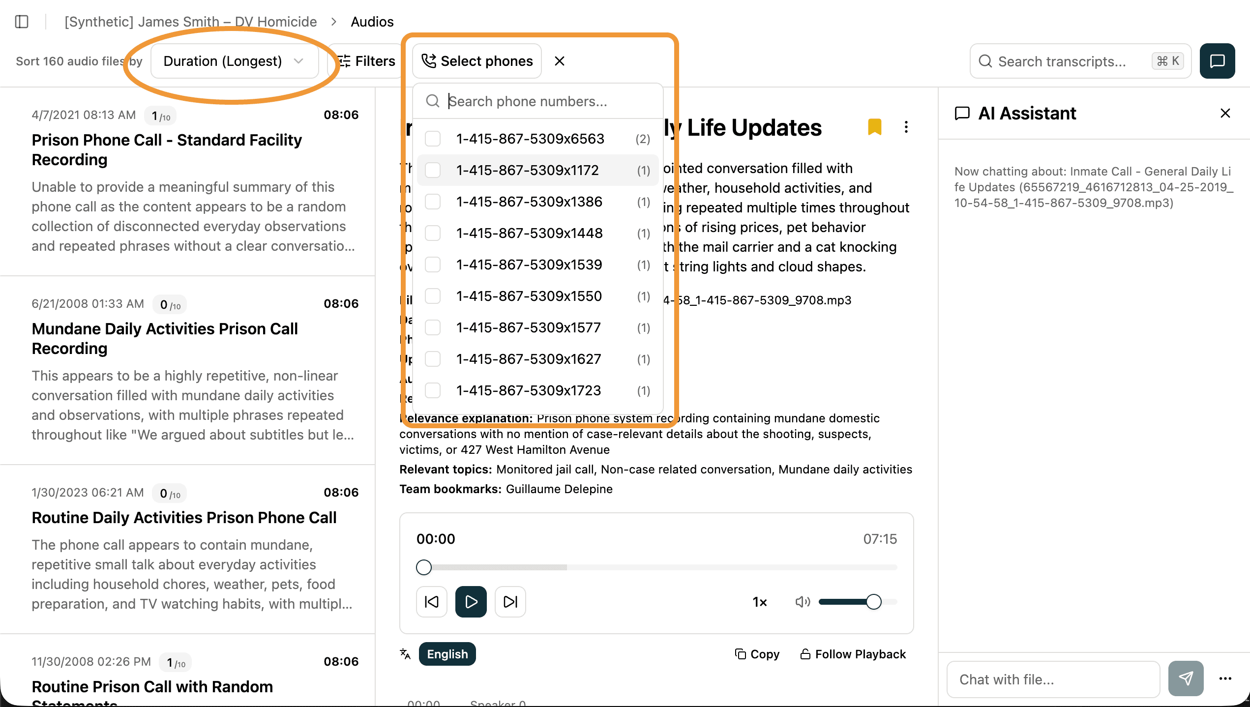 - **South San Francisco PD (Homicide)** --- 25 hours of recordings reviewed in minutes. Detectives uploaded hours of jail calls and witness interviews. Longeye surfaced the key conversations and connections in a fraction of the time.