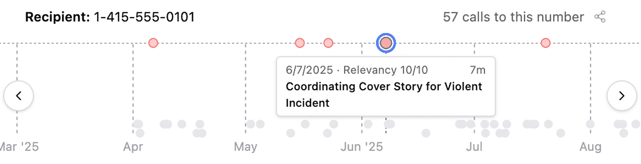When you review large volumes of jail calls, Longeye now plots repeated calls to the same phone number on a timeline. We highlight relevant calls, and you can click different dots to jump from call to call quickly. We’re hearing this has been really helpful for local PD’s collaborating with federal units on fugitive searches.